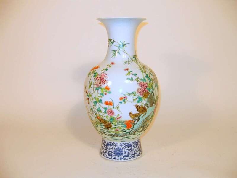 The flared rim issues from a high shouldered body, raised on a tapered foot, well enameld body depicting ground birds and mums, blue enameled lotus scrolls to foot.