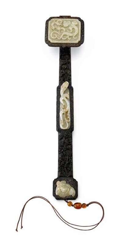 Of true golden thread zitan, rectangular head carved in fine low relief to show scrolls, bats, and lingzhi framing a celadon jade disk, well reticulated egret and lotus carved shaped handle, center with celadon jade qilong, framed by carved scrolls, terminating in a celadon bat framed by a reticulated pine, lotus and egret waterscape, simulated amber glass beads and silk tassel.