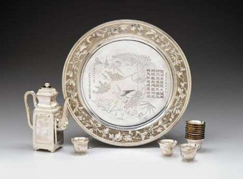 Comprising of a large circular tray, square baluster pot and twelve cups, worked to show egrets and pine trees together with incised script.