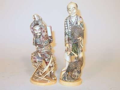 Both of single section carving, one of a swordsman, together with a taller fisherman.