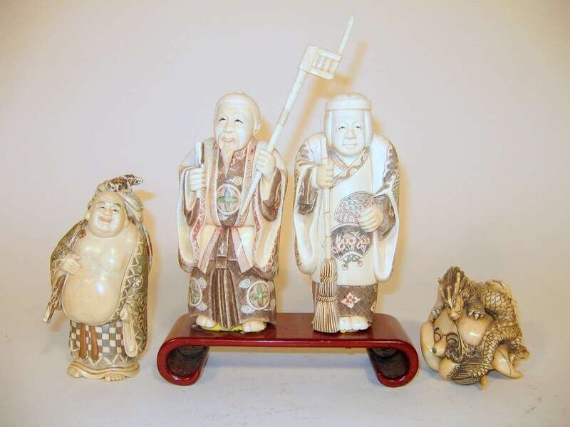 Comprised of a pair of standing ancestors, Budai and a dragon and squid okimono.