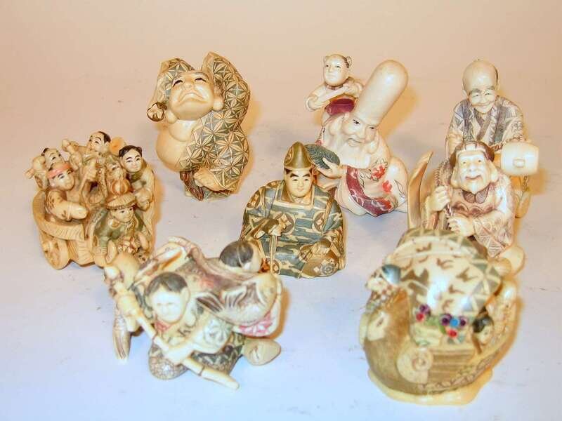 Eight Japanese stained elephant and mammoth ivory models