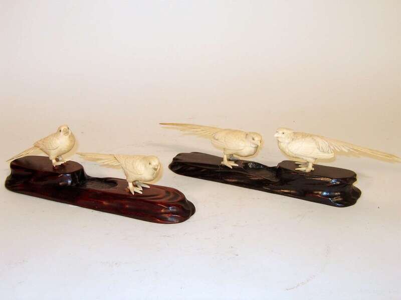 Worked to show two pairs of carved long-tails over wood stands, mother-of-pearl inlaid eyes.