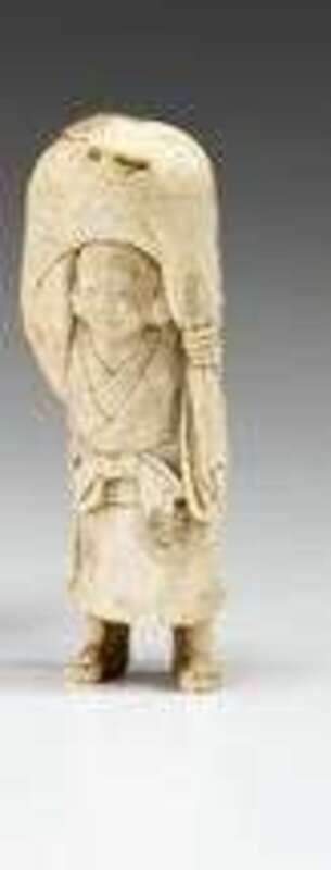 Large staghorn worked to show a vendor supporting a bag, detail to robe, together with a staghorn netsuke.
