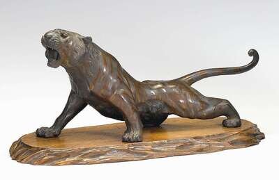 Well cast, patinated stripes to lunging standing beast, over wood stand.