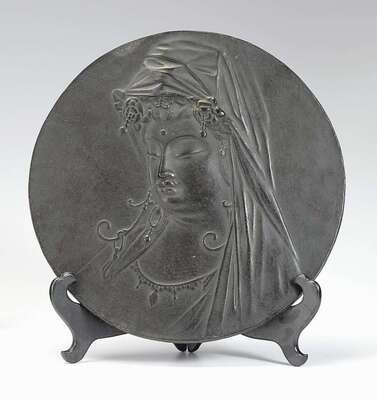 Of heavy circular form, cast to show kannon in medium relief, pieced rim for hanging, together with a mixed metal brushpot.