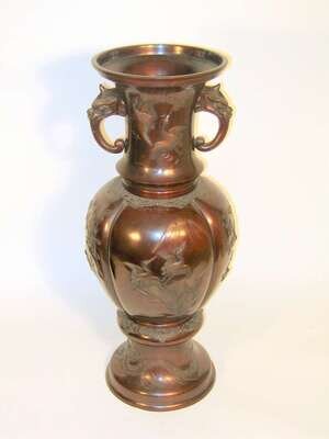 Of baluster form, rimmed mouth waisted neck issuing two mask handles, foliate molded body, body worked to show birds and floral sprigs.