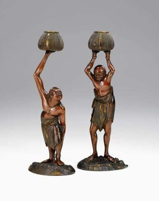 Standing figures of Ashinaga and Tenaga, both supporting baskets, over shells, signs of gilding.