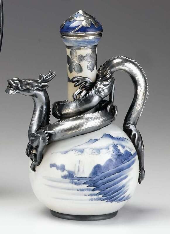 Of bottle form, urn stopper silver leaf mount and collar, coiled detailed silver dragon to body, blue landscape to body, silver base.