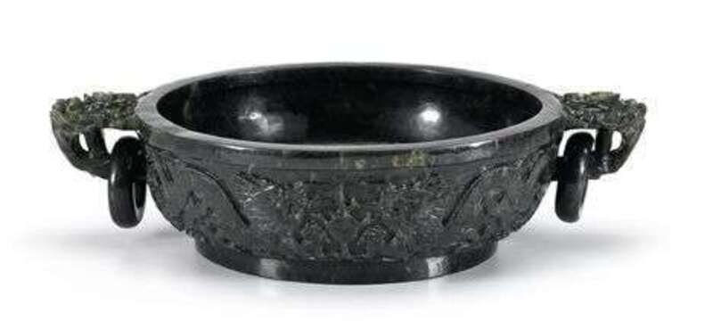 Of steep sided U-shape, carved to show foliate handles supporting free-hanging rings, dragon carved to outer-wall and underside.