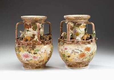 Large and unusual pair of earthenware satsuma applied vases unusual signed impressed gourd mark, 19/20th century