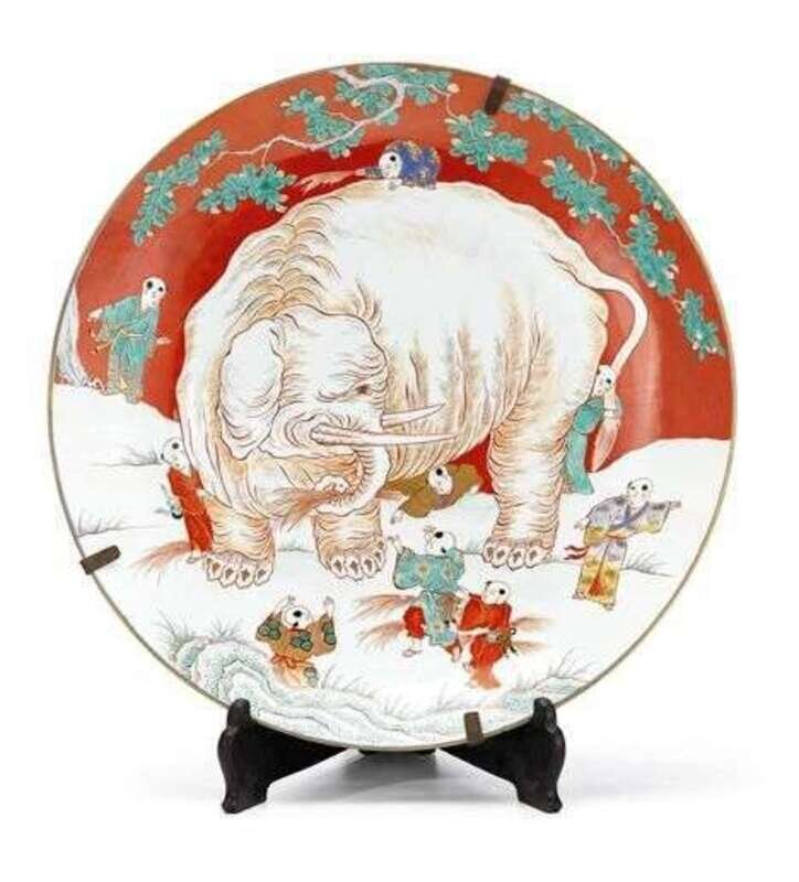Of slightly rounded form, decorated in iron-red, gilt and enameled to show boys with baku or elephant.