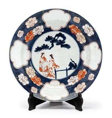 Of stepped shallow form, cobalt blue underglaze framing four cartouches and a central medallion of two bijin, gilt decoration worn from surface.