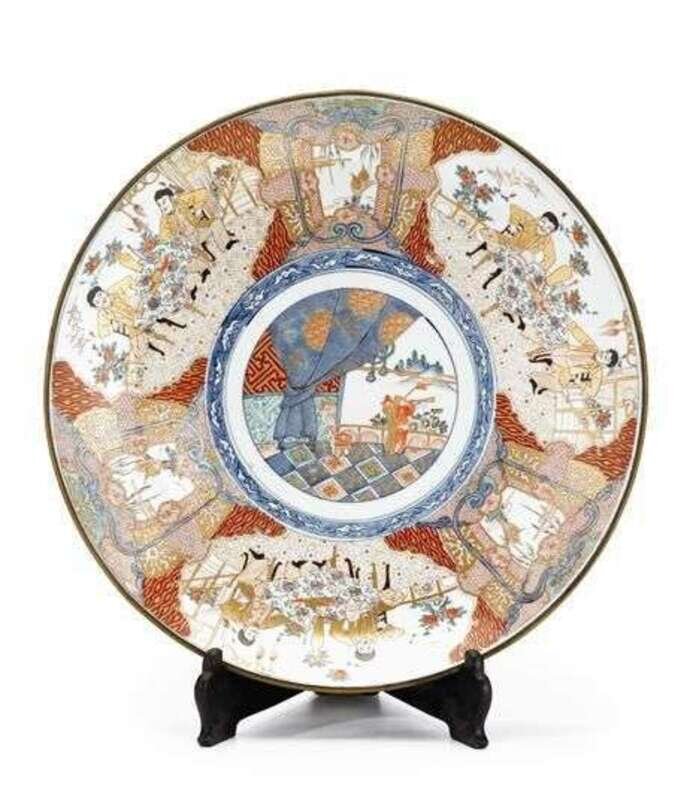 Of slightly rounded form, well enameled to show four cartouches of seated gentleman framing a central medallion.