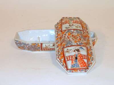 Of elongated hexagon shape, pieced cover encloses an interior fitted with two pen rests, unglazed base, decorated in the typical palette.