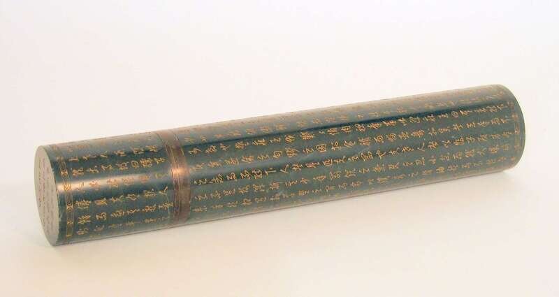 Of long cylindrical form, screw top cover and matched base inscribed with gold colored script and three seal marks.