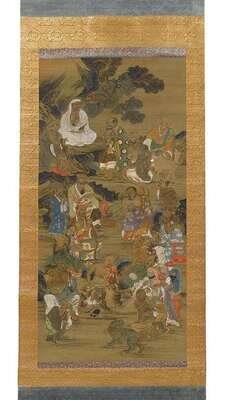 Color wash on ink on champagne silk, depicting various lohan and animals amongst a landscape.