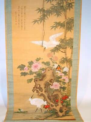 Color and ink on champagne silk, depicting white egret over lotus pond, rows of script and seal mark, hanging scroll.