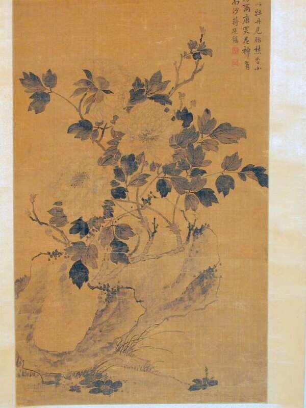 Hanging scroll, ink on champagne silk, depicting blossoms, three rows of script and red seal mark.