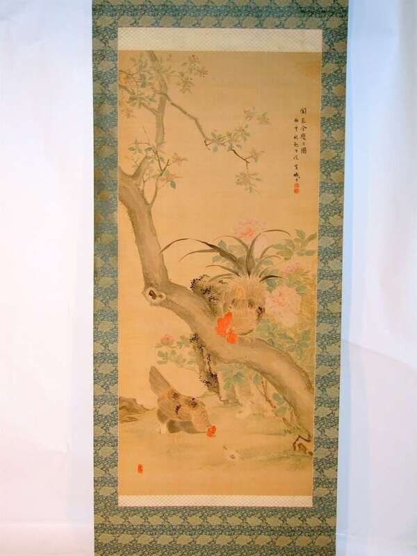 Hanging scroll, color wash and ink on champagne silk, depicting chickens and ground birds amongst a foliate garden, two rows of script and two red seal marks.
