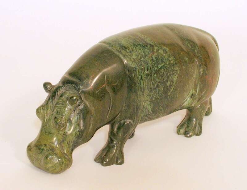 Robustly modeled, head towards the ground, standing on all fours, some minor brown and light inclusions to a dark green base.