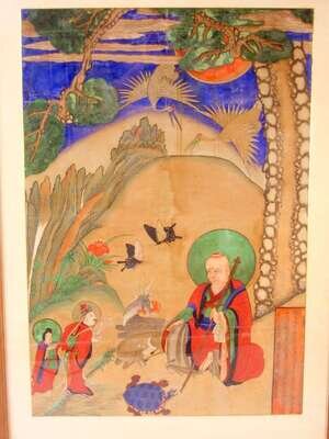 Ink and color on paper, well painted showing Soo and Bok, seated old man framed by a green halo, turtles, cranes, attendants, deer with script, and script to lower right hand corner, framed and glazed.