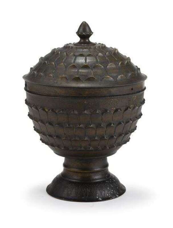 Of lotus bud form, urn finial surmounted foliate molded cover over urn shaped base raised on a cylindrical base.
