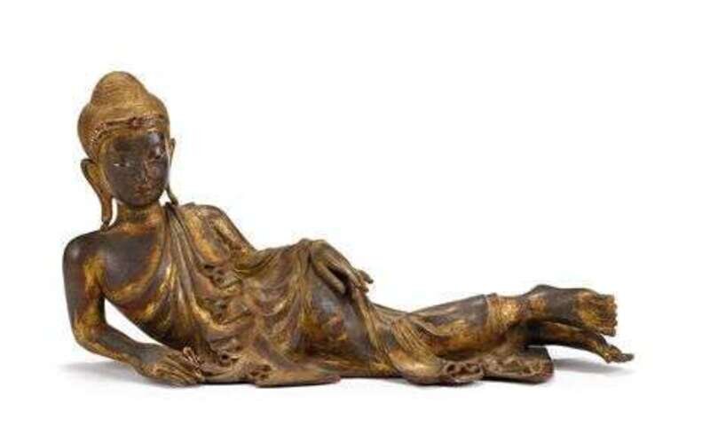 Modeled entering Parinirvana, Mandalay style, modeled on his mahdaparinivana, the slender body covered in flowing monk's garment, left hand over thigh and right supports the body, jeweled band to forehead, good dignified serene expression to face.