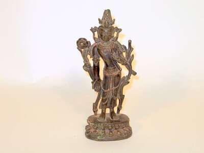 Standing in graceful tribhanga, over a double lotus thrown, body modeled with Buddha crown, jewelry and utpala planks flanking the off-centered torso, hands in varada and vitarka.