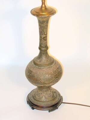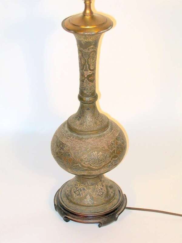 Converted to lamp, copper, white metal over brass ground, flared long neck over compressed base, wood base.