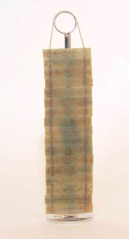 Constructed of seventeen panels incised and gold colored, strung.