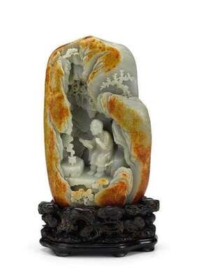 Of tall oval form, well carved to show a deep recessed rocky outcrop enclosing a seated scholar framed by pine trees, lingzhi and brown pebble skin surface, over a well carved wood stand.
