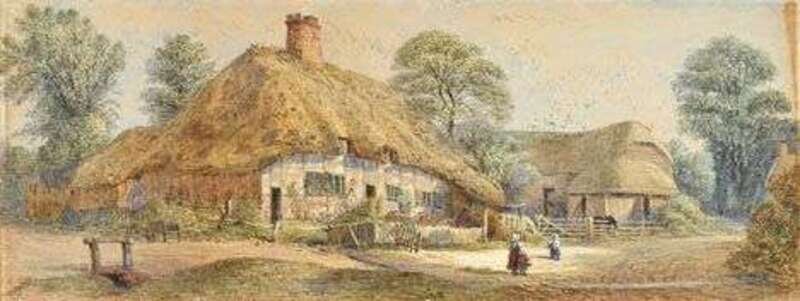 WALTER PARIS (AMERICAN 1842-1906) THATCHED ROOF COTTAGE WITH FIGURES