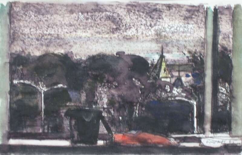 SIDNEY GOODMAN (AMERICAN B. 1936) ROOFTOPS AND HARBOR FROM WINDOW