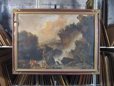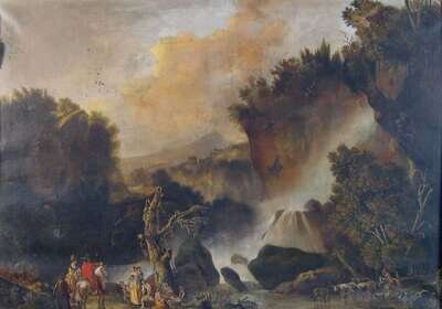 FOLLOWER OF JACOB DE HEUSCH A HUNTING SCENE NEAR THE WATERFALL WITH PEASANTS AND OXEN
