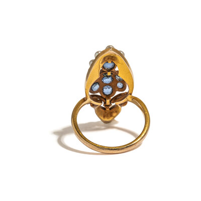 Round mixed cut sapphires, old mine cut diamond and seed pearls. Yellow gold. Ring size 6 1/2.