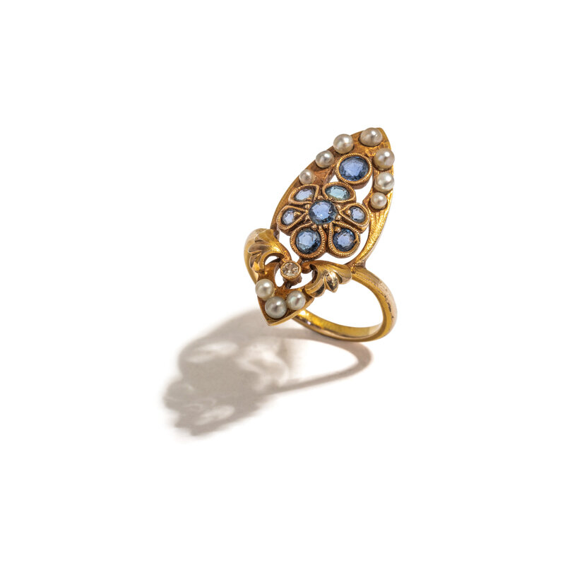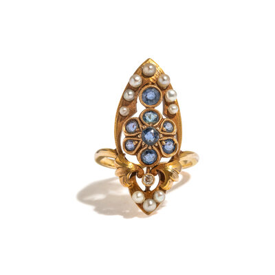 SAPPHIRE, DIAMOND AND SEED PEARL RING
