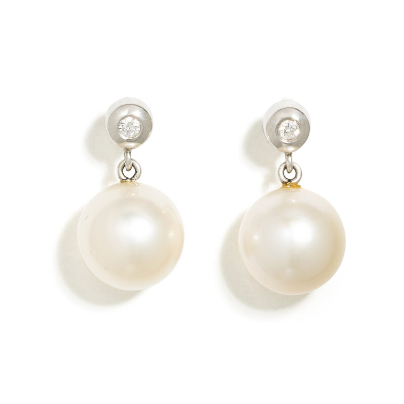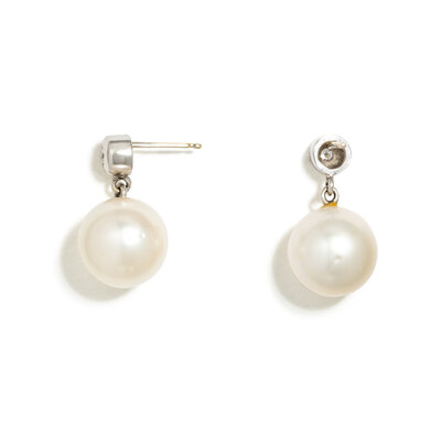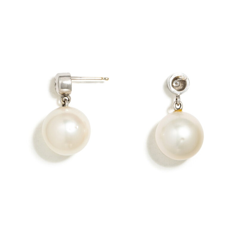 Cultured South Sea pearls measuring approximately 11.20 mm and round brilliant cut diamonds. 18 karat white gold. 3/4 inch long.