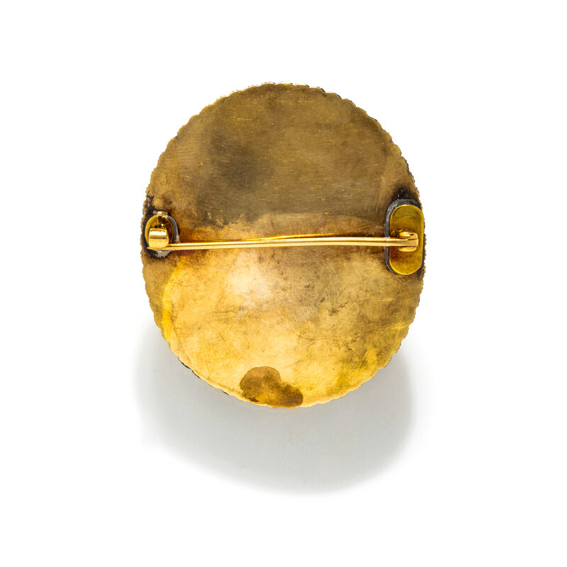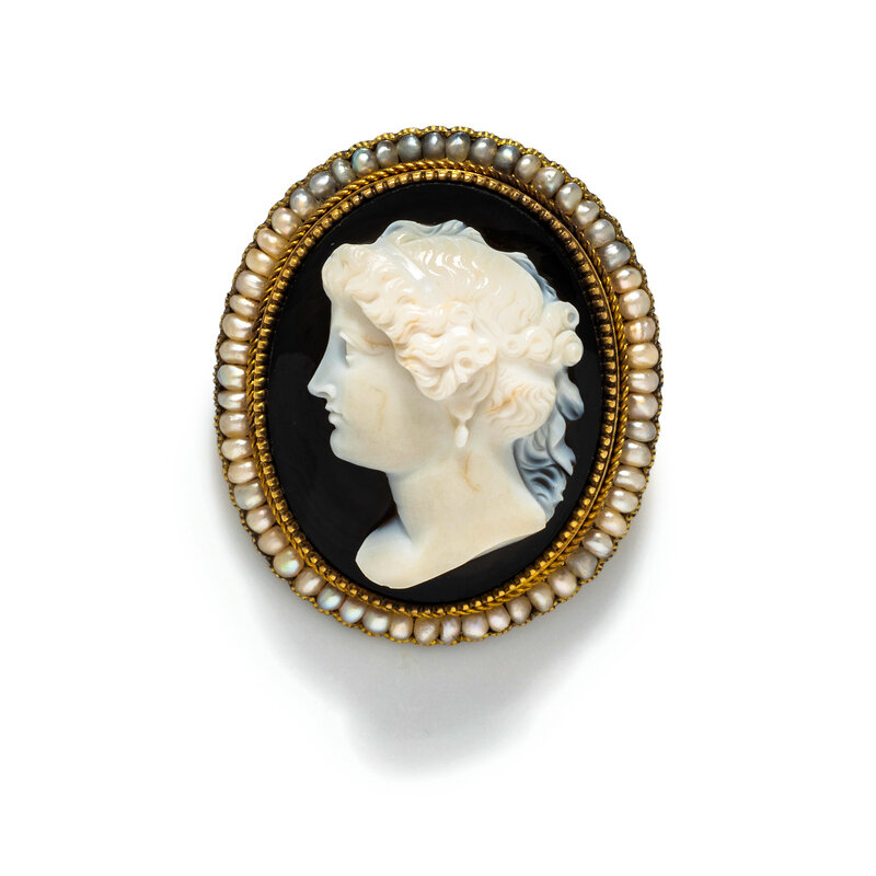 YELLOW GOLD, SEED PEARL, AND HARDSTONE CAMEO BROOCH