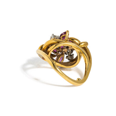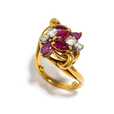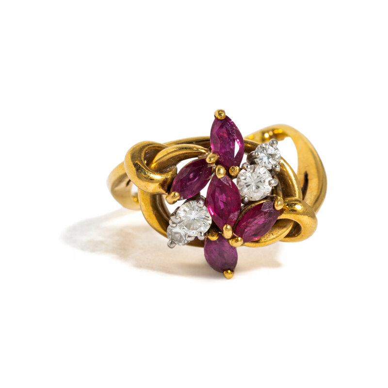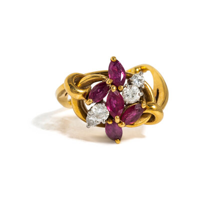 Marquise cut rubies and round brilliant cut diamonds. Yellow gold. Ring size 6.