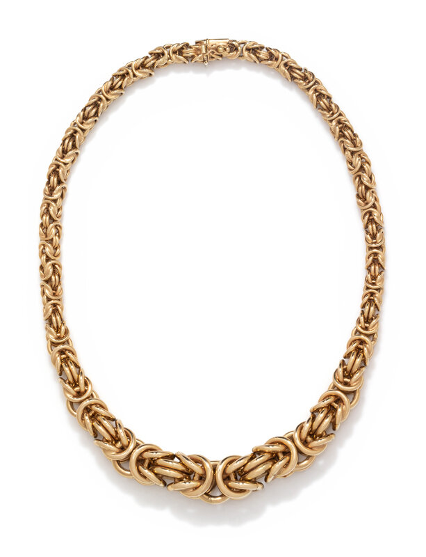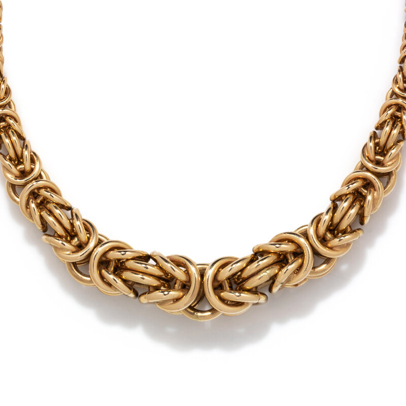 Graduating byzantine links measuring approximately 6.00-14.00 mm. 14 karat yellow gold. 15 1/2 inches long.