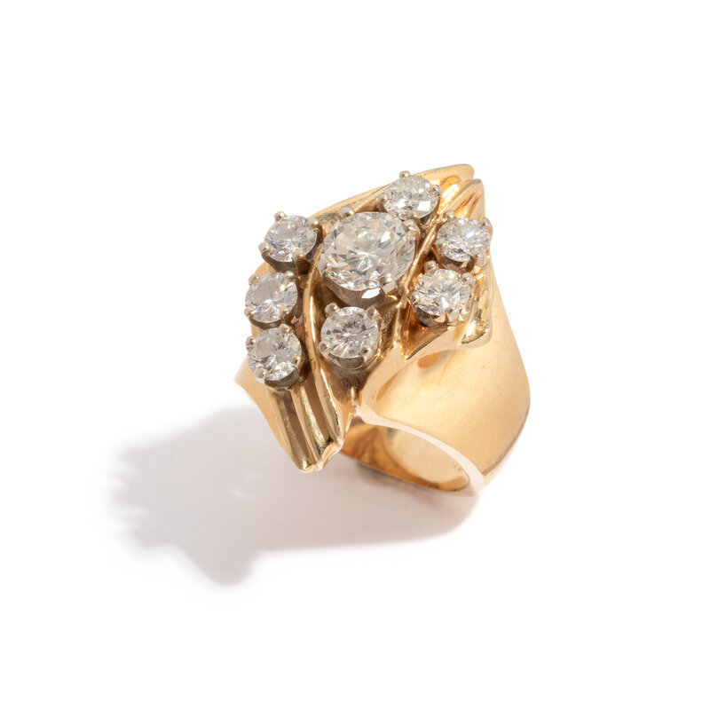 Round brilliant cut diamonds weighing approximately 2.40 carats total. Ring size 5 1/2.
