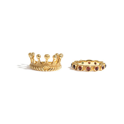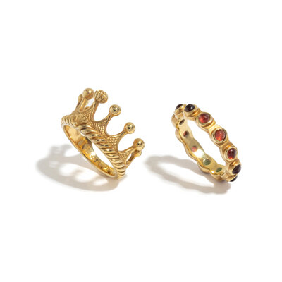 Consisting of a Cynthia Bach 'Princess Tiara' ring, together with a band ring set with round cabochon garnets. Ring size 6 3/4.