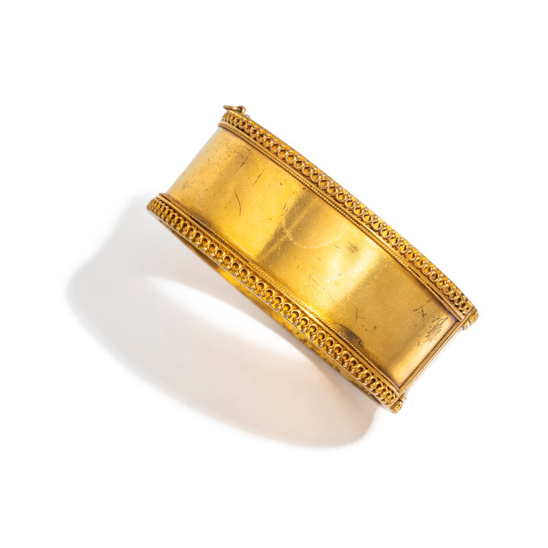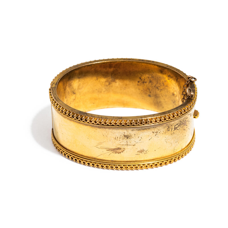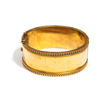 Hinged with side clasp. Yellow gold. 6 inches inner circumference, 1 inch wide.