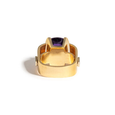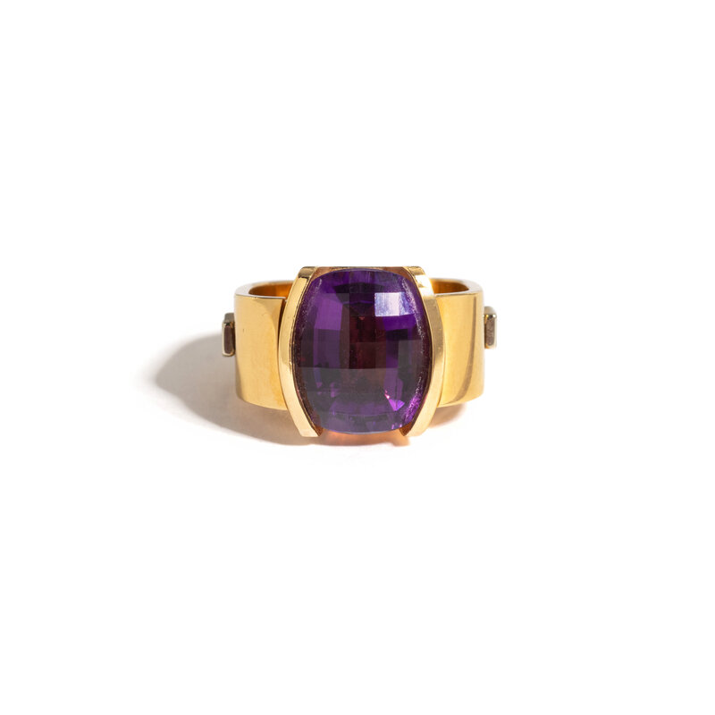Oval checkerboard cut amethyst measuring approximately 10.75 x 13.00 mm and round brilliant cut diamonds. 18 karat yellow gold. Ring size 4 ½ - 6 ¾.