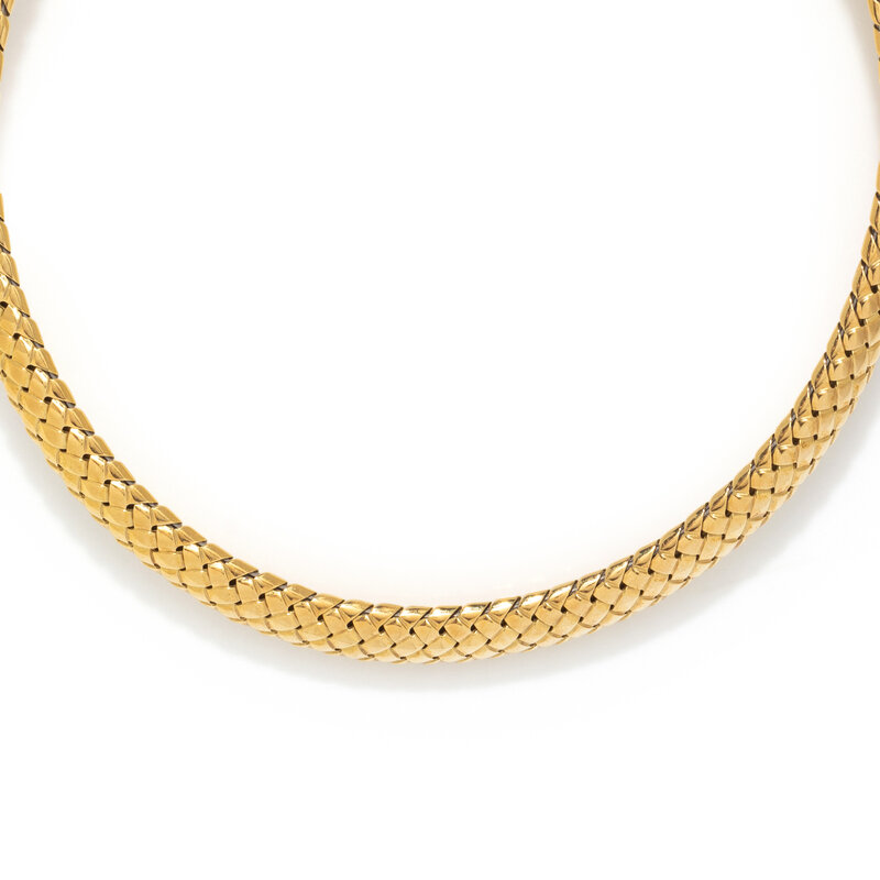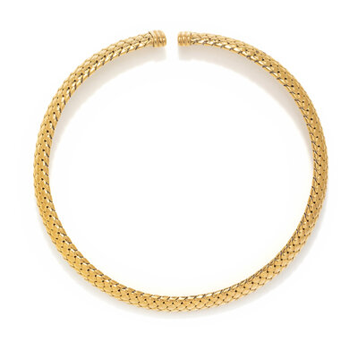 Woven collar necklace with flexible opening. 18 karat yellow gold. 13 inches inner circumference.