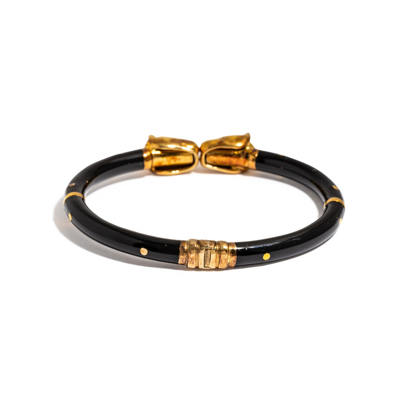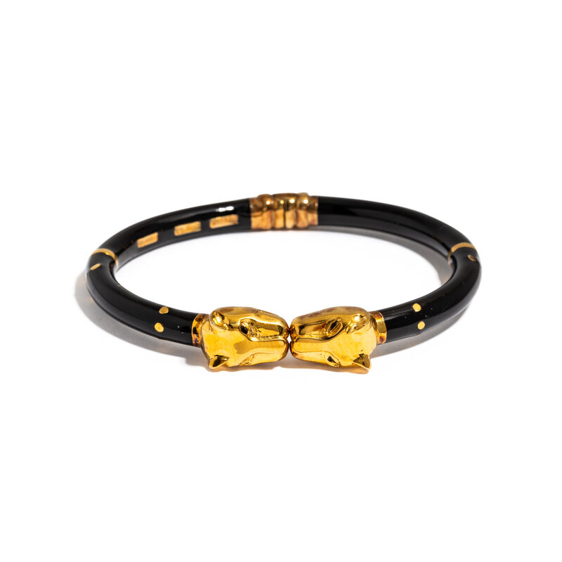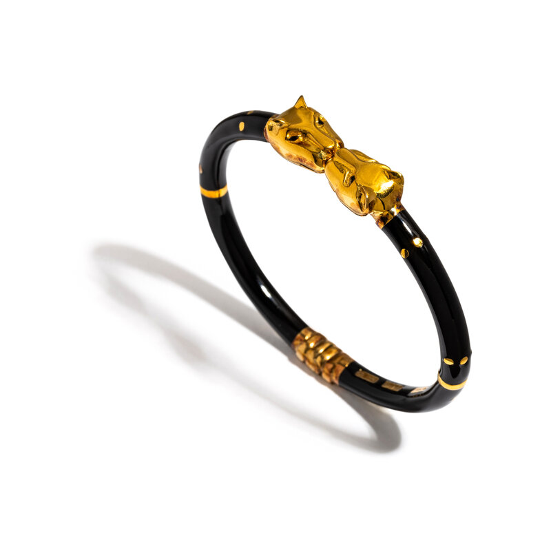 Black enamel and panther heads, measuring approximately 6.00 mm wide, hinged at the back. 7 inches inner circumference.