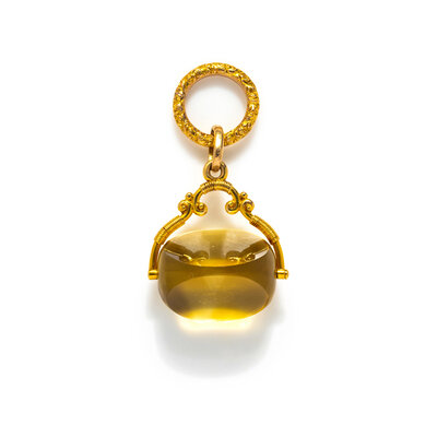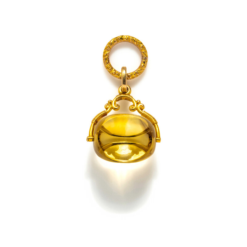 Smooth-corned triangular prismatic citrine measuring approximately 21.00 x 21.00 x 25.00 mm. Yellow gold. 2 ¼ x 1 ¼ inches.