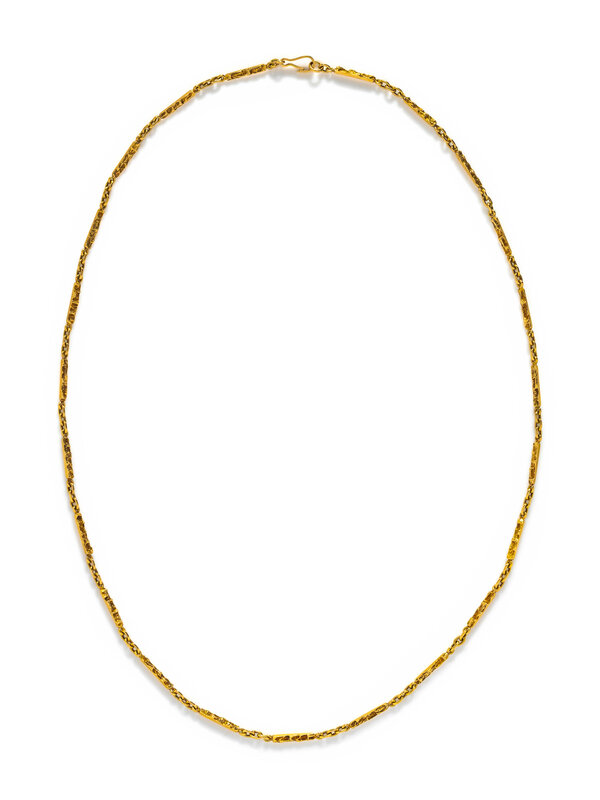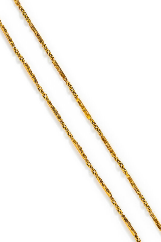 Fancy textured bar link chain. 14 karat yellow gold. 29 inches long.