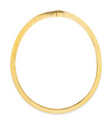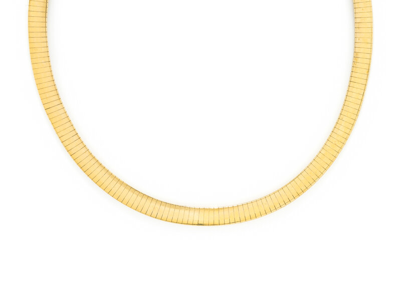 Omega links measuring approximately 8.00 mm wide. 14 karat yellow gold. 15 3/4 inches long.
